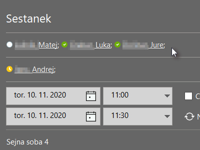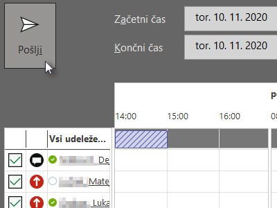 ![]() Outlook vam bo na koledarju pokazal, kako so vaši sodelavci zasedeni in kdaj imajo čas. V mojem primeru sem moral izbrati drugi termin tako, da sem kliknil na polje pod uro. |
