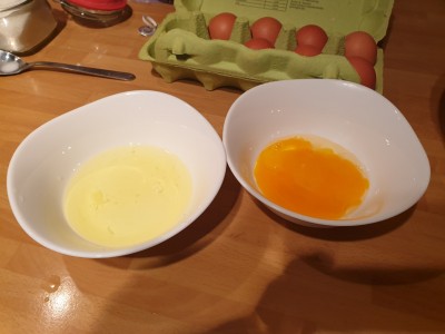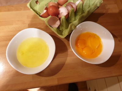 V drugem delu bomo pripravili kremo za torto. Vzemite 3 jajca in ločite beljake od rumenjakov. |