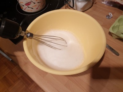 V posodi beljake stepite v ne preveč trd sneg in med tem dodajte ščepec sladkorja. |