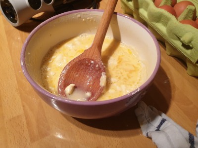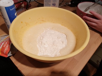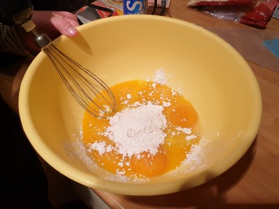 Jajčni zmesi dodajte 250 gramov sladkorja in vrečko bourbonskega vanilijevega sladkorja. Dodajte še 1 deciliter vode, malo žličko sončničnega olja, 1 malo žlico ruma in premešajte.
