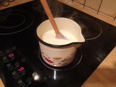 To posodo stresite v lonec, kjer ste prej malenkost zavreli 3 decilitre mleka in 30 gramov sladkorja. Mešajte vse skupaj okoli 5 minut, da nastane lepa krema. Pripravljeno kremo dajte na hladno. |
