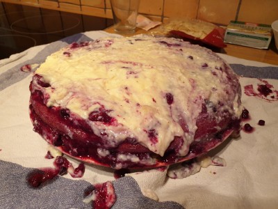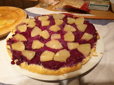 Dodajte polovico pripravljenega preliva iz jagod in borovnic na pecivo ter dodajte čez še male koščke ananasa. |