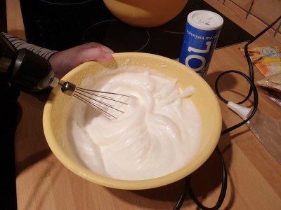 Beljake skupaj s ščepcem soli stepemo v trd sneg in postavimo posodo na hladno. |