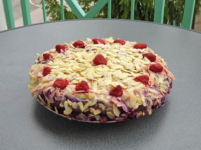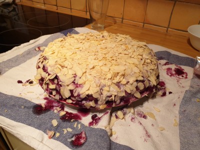 Vse skupaj posujte z 200 gramov mletih mandljev in postavite pripravljeno torto v hladilnik za čez noč. |