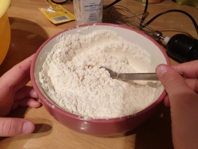 V posebno posodo dodajte 250 gramov pšenične moke, pecilni prašek in ščepec sode bikarbone ter nežno z žlico premešajte. |