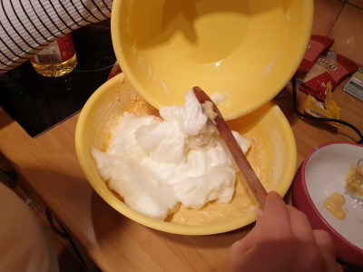 Potem pa v to posodo dodajte še sneg, ki ste ga pripravili iz beljakov. Vse skupaj nežno premešajte, da dobite lepo maso za biskvit.