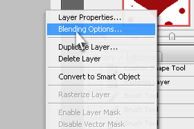 Izbremo Layer z obliko (srcem) in kliknemo nanj z desnim klikom ter izberemo Blending Options.