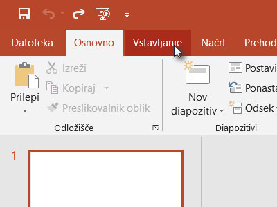![]() Ustvarite novo PowerPoint predstavitev in pobrišite najprej vse na njej. Pritisnite tipki Ctrl + A, da označite vse in nato tipko Del, da pobrišete. Potem pa kliknite na zavihek Vstavljanje. |