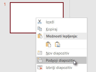 ![]() Kliknite z desnim miškinim gumbom na diapozitiv na levi strani in izberite Podvoji diapozitiv. |