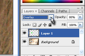 Določite layerju senčenje na Overlay in Opacity znižajte na okoli 80% (glej sliko)