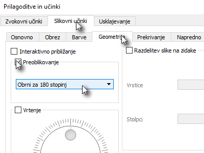 ![]() Odprite VLC predvajalnik. Kliknite na Orodja in izberite Filtri in učinki. V novem oknu kliknite na zavihek Slikovni učinki in nato Geometrija. Označite Preoblikovanje in nastavite Obrni za 180 stopinj. |