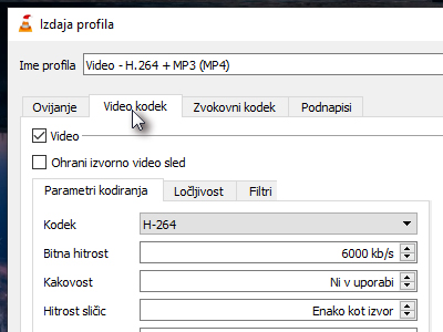 ![]() Kliknite na Video kodek in najprej nastavite nastavitve za kodiranje. Kodek H-264 je verjetno najbolj primeren, Bitna hitrost je odvisno od kvaltite vašega posnetka. 6000 kb/s bo povsem v redu. |