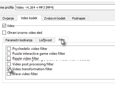 ![]() Kliknite na zavihek Filtri. Spodaj označite Video transformation filter. Kliknite na gumb Shrani. |