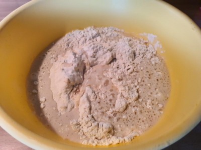 V večjo posodo natresite moko in nato vlijte prej pripravljeno vodo s kvasom.