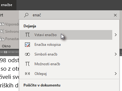 ![]() Če ne najdete kakega ukaza, ga lahko tudi poiščete. Na primer, če bi rad vstavljal enačbe, bom kliknite v polje za iskanje, začel pisati želen ukaz in ta se mi bi prikazal v zadetkih. |