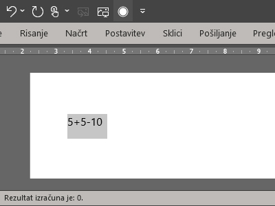 ![]() Označite matematično formulo, kliknite na ukaz Izračunaj in Word vam bo prikazal rezultat. Za prikaz ukaza Izračunaj kliknite na Datoteka in izberite Možnosti. Označite Orodna vrstica za hitri dostop. Izberite ukaze v naboru označite Vsi ukazi in nato v trak dodajte ukaz Izračunaj. |