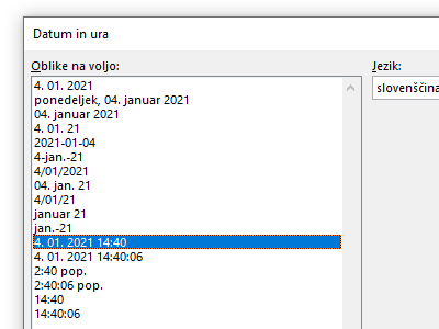 ![]() Čas in datum se lahko samodejno obnovi ob odprtju dokumenta. Kliknite na zavihek Vstavljanje in izberite Datum in ura. V novem oknu označite Samodejno posodobi. |
