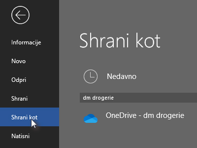 ![]() Dokument lahko shranite kot PDF dokument ali spletno stran. Kliknite na Datoteka, izberite Shrani kot in nato kliknite na Prebrskaj. V novem oknu nastavite vrsto datoteke kot PDF ali HTML. |