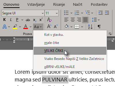 ![]() Označite črko ali besedo ali pa celoten stavek ter mu naenkrat spremenite vse črke v velike tiskane črke. Ko boste označili, kliknite na ikono Aa in spremenite možnost. |