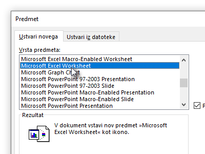 ![]() V dokument lahko vstavite tudi druge datoteke, kot sta na primer PDF ali Excelova razpredelnica. Kliknite na zavihek Vstavljanje in izberite Predmet. V novem oknu označite Prikaži kot ikono. |
