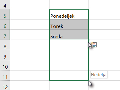 ![]() Da boste takoj zapolnili celice v logičnem zaporedju, najprej označite celice z podatki, potem pa označeni del primite za rob in povlecite navzdol oziroma na desno. |