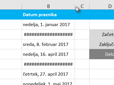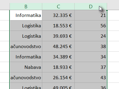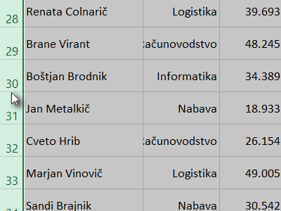 ![]() Če je stolpec prekratek, lahko z miško davkrat kliknete na črtico, ki predstavlja mejo med stolpceoma, ta pa se bo samodejno razširil na širino najdaljšega podatka v celici. |