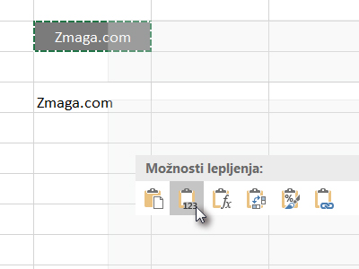 ![]() Če želite kopirano celico prilepiti brez oblikovanja, to storite tako, da kliknete z desnim miškinim gumbom in izberite željeno možnost lepljenja. |