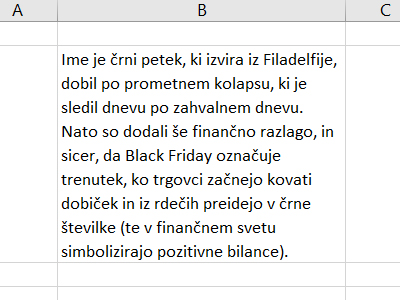 ![]() Če želite, da se besedilo lepo prikaže le v širini celice in ne skozi njo, jo najprej označite in v zavihku Osnovno izberite Prelomi besedilo. |