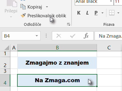 ![]() Označite celico, ki je že oblikovana, potem pa v zavihku Osnovno kliknite na Preslikovalnik oblik in kliknite na neoblikovano celico. Preslikovalnik oblik vam bo takoj kopiral oblikovanje ene celice v drugo. |