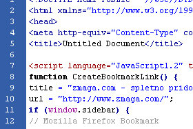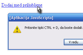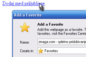 <script language="JavaScript1.2" type="text/javascript"> function CreateBookmarkLink() { title = "zmaga.com - spletno pridobivanje znanja"; url = "http://www.zmaga.com/"; if (window.sidebar) { // Mozilla Firefox Bookmark alert("Pritisnite tipki CTRL + D, da boste dodali zmaga.com v Firefox-ove zaznamke!"); } else if( window.external ) { // IE Favorite window.external.AddFavorite( url, title); } else if(window.opera && window.print) { // Opera Hotlist return true; } } </script> V tej kodi lahko tudi spreminjate ime in spletni naslov vaše strani. Za več informacij se obrnite na forum. |