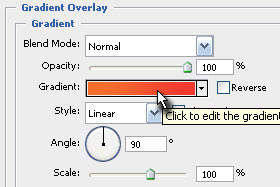 ![]() Kliknite na Gradient Overlay in tudi tokrat uporabite iste nastavitve kot jaz ter kliknite na izbirnik preliva (glej sliko). |