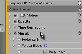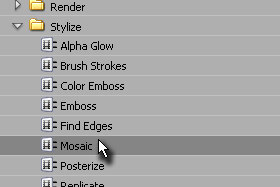 ![]() Sedaj pa v oknu Effects, izberite Video Effects, Stylize in držite z miško Mosaic... |