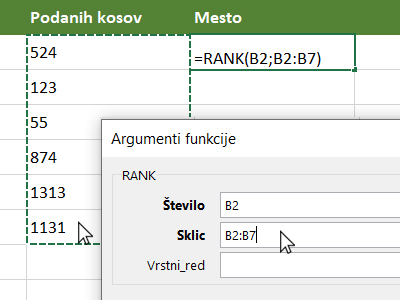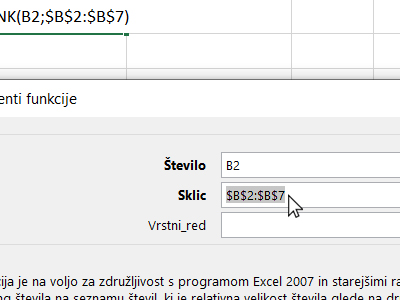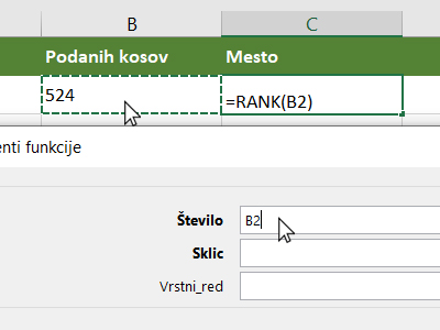 ![]() V novem oknu izberite kategorijo Vse. Potem pa v polju izbiranja funkcij poiščite, označite RANK in kliknite V redu. |