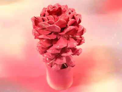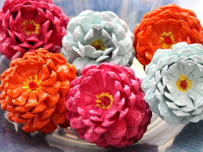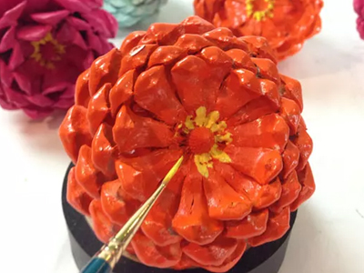 ![]() Če želite izdelek še bolj popestriti, lahko s pomočjo čopiča in barve oblikujete dno stroža v obliki rože. |