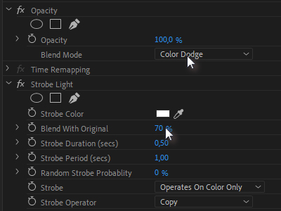 ![]() Black Video na časovnici naj bo z miško označen. V oknu Effect Controls Opacity nastavite na Color Dodge. V polju Strobe Light pa nastavite Blend With Original na 70 % (glej sliko). |