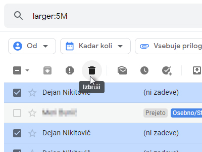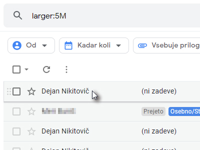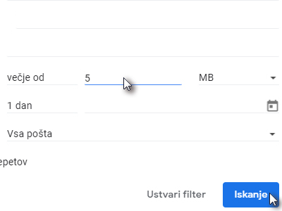 ![]() V filtru nastavite večje od 5 MB ter kliknite na Iskanje. Lahko začnete tudi z 10 MB, da boste najprej počistili res velika sporočila. |
