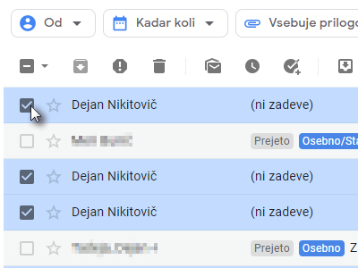 ![]() Označite nato sporočila, ki jih ne potrebujete več. Gmail vam označena ob pregledovanja sporočil ne bo prekinil označevanja. Vi pa vsekakor preverita vsa sporočila, preden jih brišete, saj ne želite izgubiti kakega posebnega spomina. |