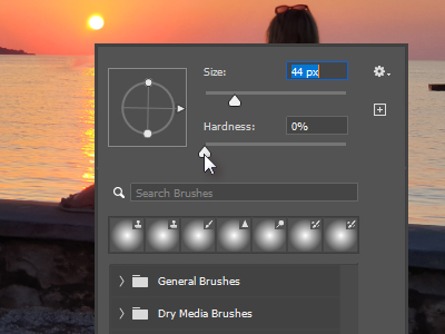 ![]() Nato sem kliknil z desnim miškinim gumbom na sliko in nastavil veliko čopiča za kloniranje in Hardness na vrednost 0% (glej sliko). |