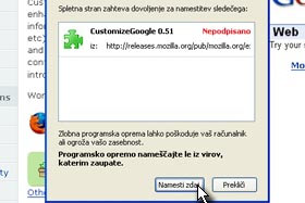 Odpre se vam podstran z razširitvjo customizegoogle. Kliknite na povezavo Install Now.