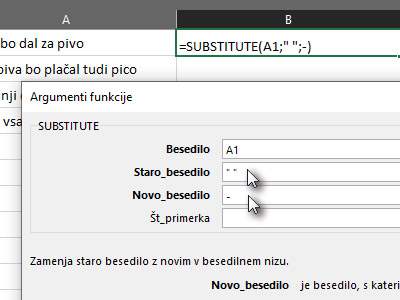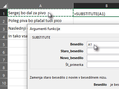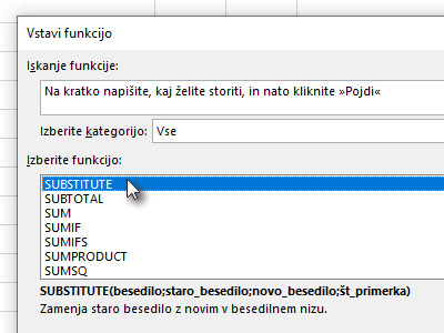 ![]() V novem oknu nastavite kategorijo Vse in nato odprite funkcijo SUBSTITUTE. |