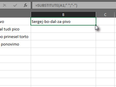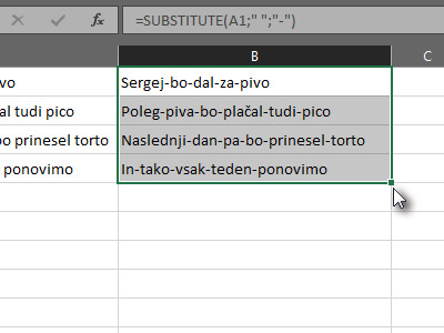 ![]() Excel bo zamenjal vse presledke z nastavljenim znakom. Celico sedaj primite za rob in jo povlecite ... |