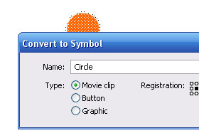 Potem pa pritisnite tipko F8 in v novem oknu v polje name vpišite Circle in Type določite Movie clip. Potrdite na gumb OK. |