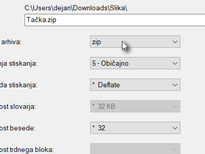 ![]() Vrsta arhiva najprej nastavite na zip. Zip je najbolj razširjen in podprt format za arhiviranje, zato vam ta ne bo povzročal težav. |