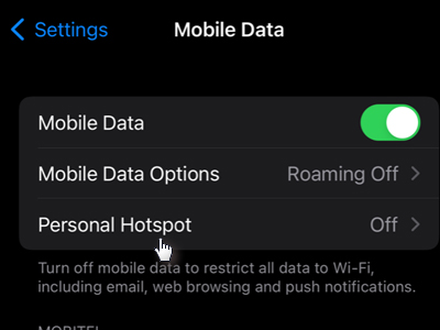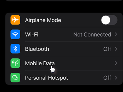![]() V nastavitvah odprite Mobile Data. Lahko bi izbrali tudi Personal Hotspot. |