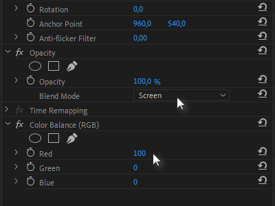 ![]() V oknu Effect Controls nastavite temu videoposnetku Blend Mode na Screen. Potem pa v polju Color Balance (RGB) nastavite Red na 100, ostali dve vrednosti pa na 0 (glej sliko). |