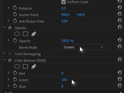 ![]() V oknu Effect Controls nastavite temu videoposnetku Blend Mode na Screen. Potem pa v polju Color Balance (RGB) nastavite Green na 100, ostali dve vrednosti pa na 0 (glej sliko). |
