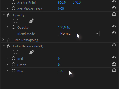 ![]() V oknu Effect Controls nastavite temu videoposnetku Blend Mode na Normal. Potem pa v polju Color Balance (RGB) nastavite Blue na 100, ostali dve vrednosti pa na 0 (glej sliko). |