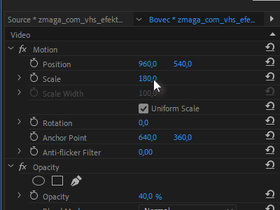 ![]() V oknu Effect Controls mu v polju Motion nastavite s pomočjo Scale velikost, da se bo prilagodil vašemu videoposnetku (glej sliko). |