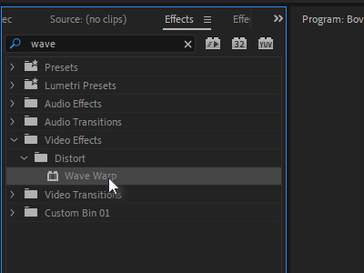 ![]() V oknu Effects pod Video Effects, Distort primite z miško Wave Warp ... Okno Effects prikažete tako, da kliknete zgoraj na Window in izberete Effects.