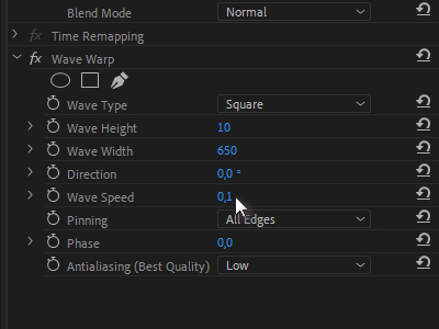 ![]() V oknu Effect Controls za Wave Warp nastavite podobne vrednosti kot so vidne na sliki. Okno Effect Controls prikažete tako, da kliknete zgoraj na Window in izberete Effect Controls.